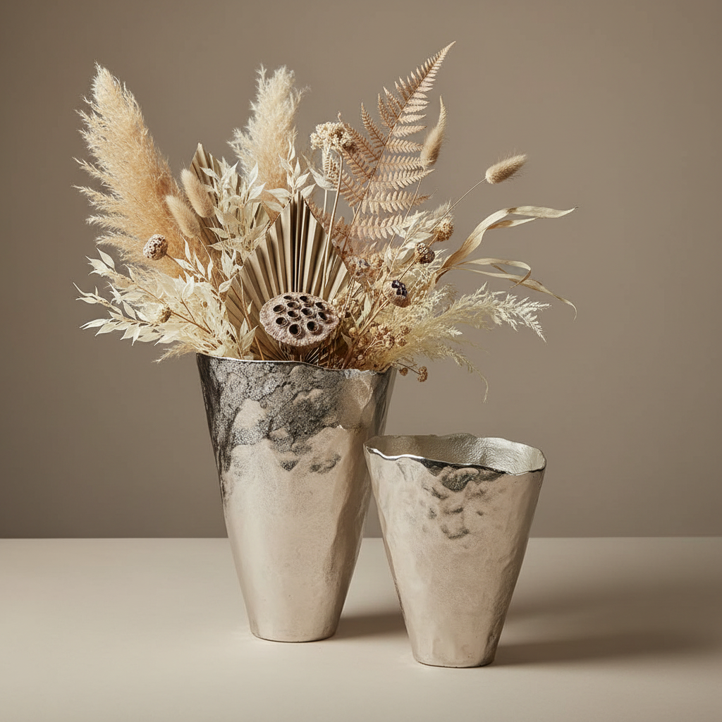 Available in two refined sizes, the Kalahari Vase can be styled individually or paired together for layered visual impact. Its softly tapered silhouette and earthy metallic tones make it a versatile addition to modern, coastal and contemporary interiors.